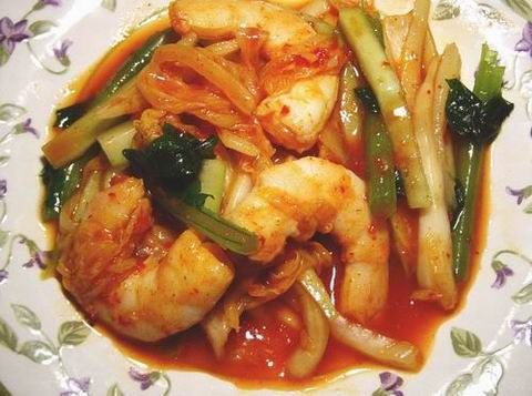 ariel看到我去LA廝殺大買的戰利品中有一桶泡菜,就提供了這個食譜。真的好好吃喔,我可以作證。只不過這裡沒買到好花枝,所以用新鮮白蝦代替,將蝦燙熟去殼,拌入切好的泡菜絲及黃瓜絲(我用的是大黃瓜),再加泡菜汁增添風味,簡單俐落。黃瓜為香濃的韓國泡菜增添一股清香,配上鮮甜的蝦肉,實在美味到不行。買到好泡菜的可以動手試試喔!