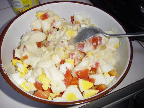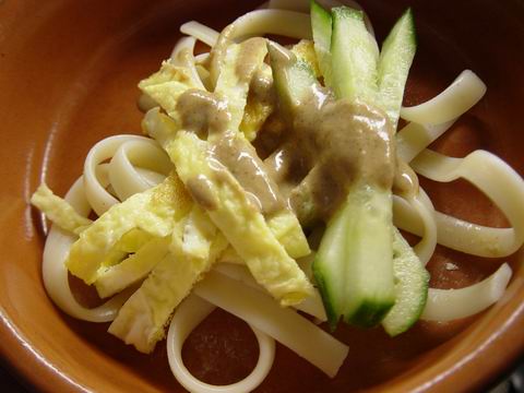 材料:煮好放涼的麵、芝麻醬、醬油、糖、白醋、鹽、水、大蒜;小黃瓜、雞蛋