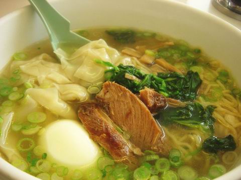 上菜上得很快,正適合肚子餓的我們。只見大大的碗公裡,拉麵上鋪了菠菜、紅燒肉、筍絲、還有我加點的餛飩和雞蛋,蔥花切成標準的細圓片,然後淋上鹽味原湯,真是非常地美味。紅燒肉是薑味的,剛好搭配鹽味的湯,雖然是偏鹹的,小瑞還是多喝了好幾口,最後是因為蔥味滲進了湯中才作罷(小灣灣不喜歡生蔥